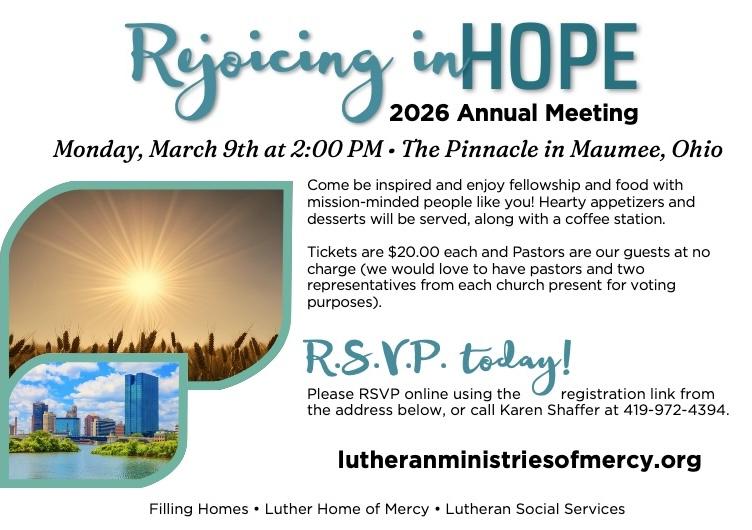 The 2026 Lutheran Ministries of Mercy Annual Meeting will be held on Monday, March 9, 2026 at 2:00 PM.