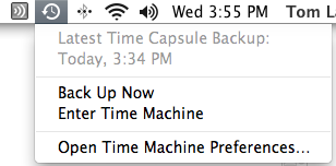Go up to top right corner of your screen and click on the clock symbol with the arrow around it. Your last completed backup will than show with a day and time, this should say something recent like in the example shown below. If your backup ever says that it's older than a week you can click on “Back up Now”. If Time Machine gives you any errors or you have any questions submit a Helpdesk Ticket so we can get this resolved for you. Please try to check this at least once a week to ensure your files are backed up.